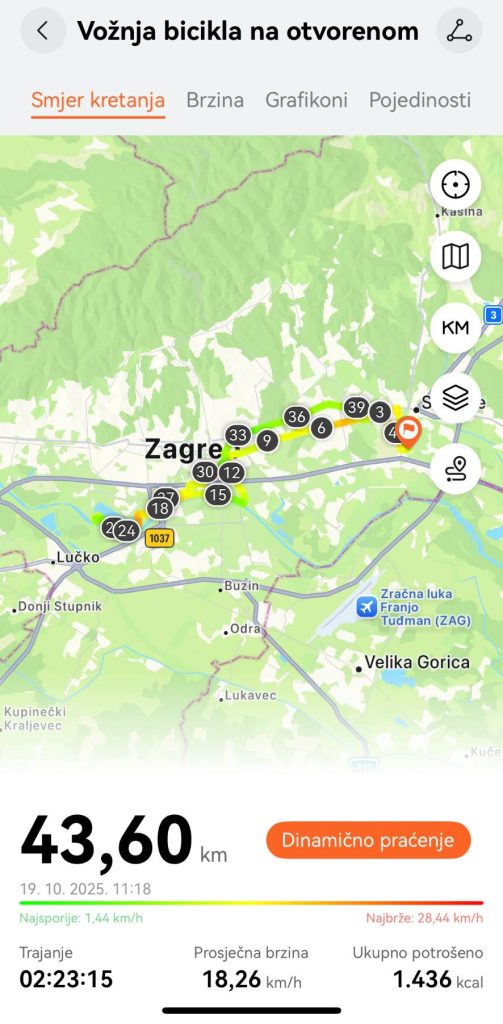 Od prvih metara bilo je jasno da Huawei GT 6 Pro nije samo „gadget za zapešće“. Reakcija na pokrete bila je trenutačna. Čim sam stao na semaforu, sat je automatski pauzirao mjerenje. Nije bilo nikakvog iole većeg kašnjenja – nakon 1 do 2 sekunde sat bi zaustavio tajmer, a pri nastavku vožnje jednako brzo bi nastavio zapis. To je detalj koji u praksi čini veliku razliku: ne moraš misliti na ručno pauziranje ni riskirati pogrešne podatke.