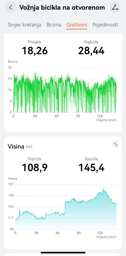 Podaci su vrlo pregledno raspoređeni: na prvom zaslonu prikazana je karta s rutom, osnovni podaci (udaljenost, trajanje, prosječna brzina), a ispod detaljni grafovi pulsa, brzine i nadmorske visine. Svaka dionica može se zumirati, a moguće je i usporediti različite vožnje kroz vrijeme. Posebno je korisno što aplikacija automatski izdvaja segmente kao „brze zone“ i daje uvid u pulsne zone – idealno ako planiraš napredak ili kontrolu intenziteta treninga.
