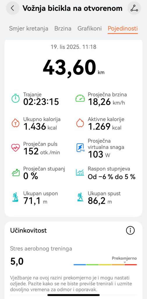 Koliko god je Juraj amater u biciklizmu, napravio je upravo ono što je trebao – maksimalno surađivao sa satom koji mu je točno pokazivao u kolikom je naporu organizam. Novi biciklistički program na Watch GT 6 Pro mjeri i snagu prenesenu na pedale (wate), pa je Juraj pritiskao u prosjeku 160 w, a u ‘peaku’ 280. Profesionalci te vrijednosti bez problema duplaju – i to je matematička prednost koja se lako mjeri, baš kao i napredak za predane rekreativce i sportaše.
